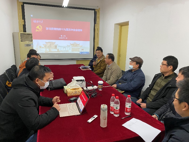 党委委员、副院长曹二保教授讲党课。曹院长带领支部党员共同学习了《中国共产党第十九届中央委员会第五次全体会议公报》,传达了《中共中央关于制定国民经济和社会发展第十四个五年规划和二〇三五年远景目标的建议》精神。通过学习,使全体党员进一步提高了对决胜全面建成小康社会十个方面的决定性成就、到二〇三五年基本实现社会主义现代化的九个方面远景目标、“十四五”时期经济社会发展六大“新”目标和新时期发展十二大主张的了解和认识,明确了学习宣传党的十九届五中全会精神是当前和今后一个时期的头等大事和首要政治任务。