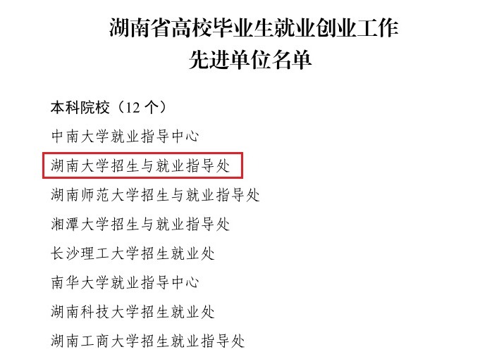 近日,湖南省高校毕业生就业创业工作先进单位和先进个人评选结果公布,我校招生与就业指导处获评就业创业工作先进单位。云天娱乐场